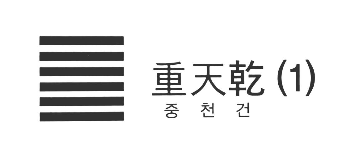 위의 그림에서 보는 것처럼, 내괘와 외괘가 모두 건천(乾天, ☰)으로, 하늘이 거듭되어 있으므로 이를 <중천 건괘>라 한다. ‘중천(重天)’이란 말은 내괘와 외괘가 하늘괘(☰)로 거듭되어 있는 괘의 상(象)을 표현한 것이고, ‘건(乾)’이란 이렇게 하늘이 거듭하여 여섯 효가 모두 양기운으로 이루어진 괘의 이름을 나타낸 것이다. 즉 괘의 이름은 ‘건(乾)’이고, 건괘의 형상은 ‘중천(重天)’이다. 따라서 ‘중천 건’이라 할 때 내괘 외괘 모두 순양으로 되어 있는 괘 기운의 양상을 떠올려야 한다.