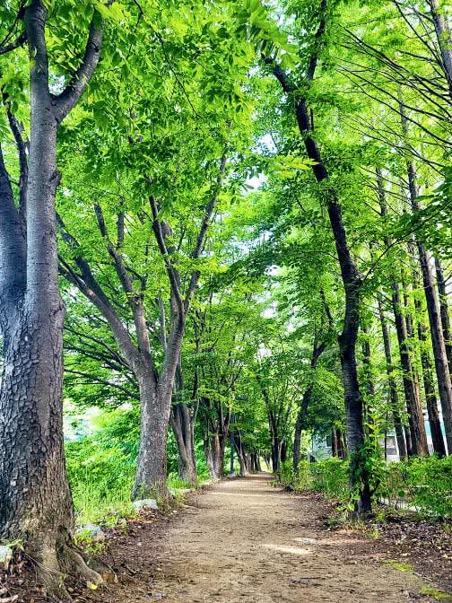 푸른 잎을 한웅 큼 훑어 꽉 쥐어짜면 푸른 물이 떨어질 듯한 산책길을 오늘 아침 걸었다. 숲이 아름다운 것은 색이 변화하며 형형색색으로 이루어지기 때문이다. 자연이 농담(濃淡, 진함과 묽음)의 붓질을 해댄다. 그리고 나무는 사람처럼 분주하거나 소란스럽지 않다. 사람의 동네에서 나무들의 동네에 들어서면 마음이 고요해 진다. 나무 사이를 걸으면 절로 나무를 닮게 된다. 숲길은 마음의 길로 이어진다. 그 옛날 당신이 걸었던 숲길을 찾는다. 그리고 처음처럼 속삭인다. "이렇게 등이 굽지 않은 언어들은 처음 보겠구나. 이렇게 사납지 않은 마음의 길들은 처음 보겠구나."
