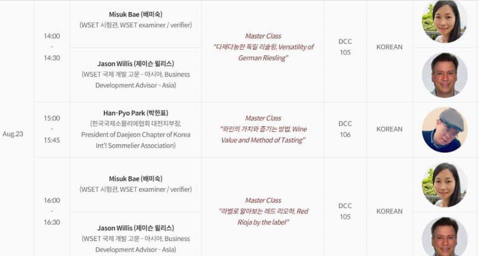 그리고 축제기간 동안, 대전 일반 시민들을 위한 세계적인 와인교육기관 WSET가 주관하는 Wine Class가 3일 동안 알차게 준비되어 있다. 와인 매니아들은 이 강의들을 통해 실력을 올릴 기회이고, 와인을 잘 모르는 사람은 배우기 시작할 기회이다. 나는 오늘 오후 3시 DCC 106호에서 "와인의 가치와 마시는 방법"에 대해 강의를 한다. 시음할 와인도 여러 병 후원 받았다. 오시면 와인의 기본 상식을 익히고, 여러 종류의 와인들을 시음해 보실 수 있다.
