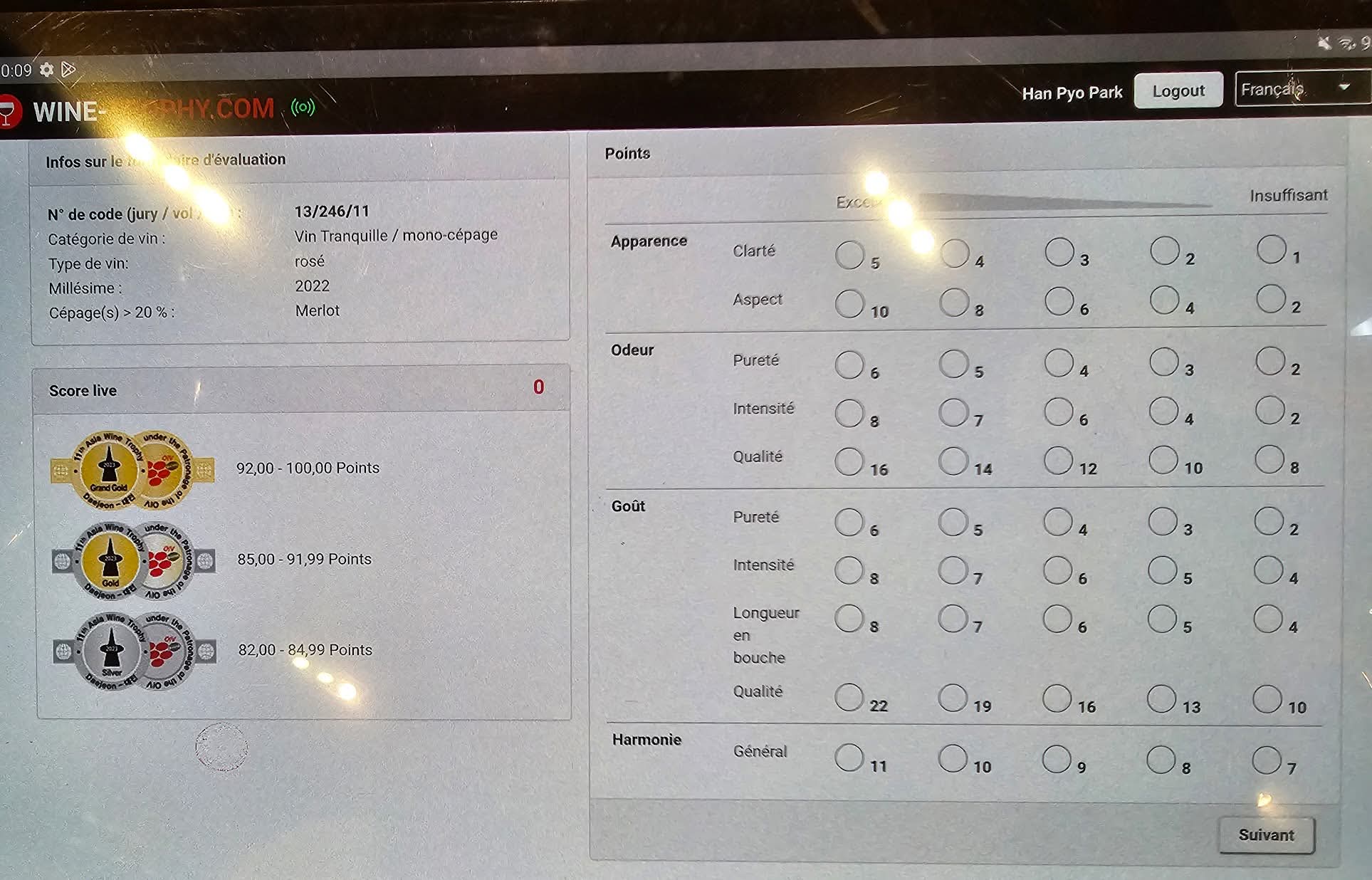 마지막으로 와인의 전체적인 인상을 판단한다. 와인의 일반성과 개성 그리고 시간이 흐르면서 숙성의 잠재 능력까지 감안하여, 와인에 점수를 준다. 이 평가는 다음 그림처럼 타블렛으로 이루어진다. 그래 자동으로 점수가 계산된다.