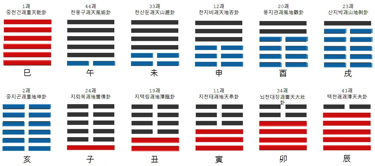 위의 그림에서 세로로 위치한 두 괘는 계절적으로 서로 정반대의 입장에 있다. 명리학적으로 지지충(地支沖)이라고 불리는 관계이다. 각각 '사해중', '자오충', 축미충', '인신충', '묘유충', '진술충'으로 불린다. 지지충(地支沖)은 사주명리학에서 12지지가 서로 충돌하며 부딪치는 상황을 의미한다.