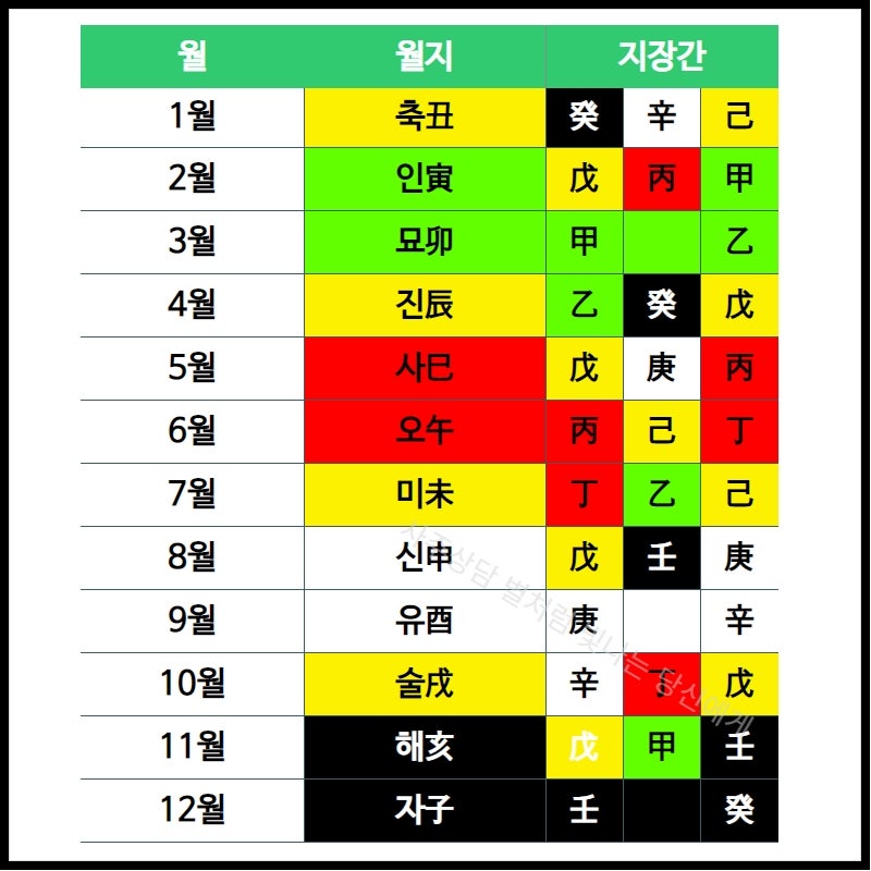 지장간(地藏干)은 12 지지 속에 숨겨진 천간을 의미합니다. '땅 지(地)', '감출 장(藏)', '천간 간(干)'이라는 한자 그대로, 땅(지지) 속에 하늘의 기운(천간)이 감추어져 있다는 개념으로, 우주 만물을 이루는 음양오행의 원리가 천간과 지지를 통해 땅에 내려와 작용하는 원리 이다. 12지지(자축인묘진사오미신유술해) 각각에 천간(갑을병정무기경신임계)의 기운이 저장되어 있는 것을 말한다. 이는 계절의 변화와 함께 지지 속에서 다양한 기운들이 어떻게 발현되는지를 파악하는데 중요한 개념이다. 위의 그림을 보면 된다. 지장간은 보통 3개의 천간으로 이루어져 있으며, 이들은 각각 가장 중심이 되는 기운인 정기(正氣), 그 다음 기운인 중기(中氣) 그리고 이전 또는 이후의 기운인 '여기(餘氣)'로 나뉜다.