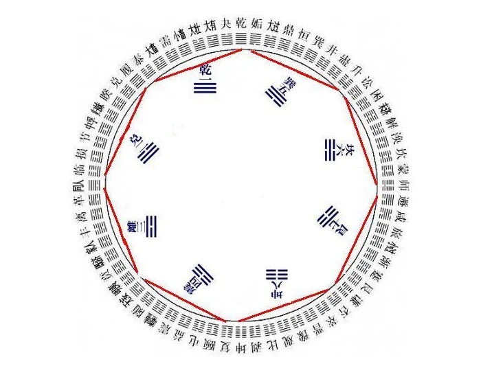 위의 그림은 세상 만물을 표상하는 64괘의 모습이다. "시초의 덕은 원을 이루어 신묘하다"는 것을 보여준다. 하늘의 뜻은 한 치의 오차도 없이 신비를 말하고 있다. 그러므로 간절한 염원이 있는 사람은 그 염원이 잘못 흘러 가득 찬 것이 되지 않도록 주의해야 한다.