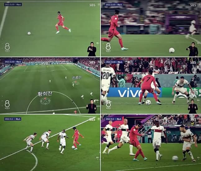"BBC스포츠에서 이 경기를 중계하던 잉글랜드 국가대표 출신의 리오 퍼디난드와 전 토트넘 감독 포체티노도 어떻게 저런 상황에서 완벽한 세기로 패스할 곳을 찾아냈는지 믿을 수 없을 정도라고 극찬했다. 16강 진출이 거의 좌절되기 직전인 후반 추가 시간- 적진에 혼자 뛰어 들어간 손흥민은 앞 뒤로 7명의 수비수에 둘러싸여 사실상 고립무원(孤立無援) 상태였다. 이 순간 손흥민의 머리 속에는 온갖 상념들이 스쳐 갔을 것이다. 공을 키핑하면서 시간을 끌 것이냐, 한번 더 돌파를 시도할 것이냐, 아니면 어떻게든 슛을 때릴 것이냐 (그 위치는 ‘손흥민 존’과 비교적 가까웠고 그는 ‘킬러’다. 그 자신도 알고 있다) 마스크를 써서 시야도 불편했을 손흥민은 마지막으로 힐끗 뒤를 돌아봤다. 황희찬이 달려오고 있었다. 황희찬이 달려오는 타이밍에 맞는 패스를 할 수 있을지도 불분명했지만, 세 명의 수비수가 앞에서 가로 막고 있었기 때문에 전진 패스 자체가 불가능에 가까웠다. 하지만 잠시 볼을 잡고 기다리던 손흥민은 수비수 다리 사이로(!) 정확한 타이밍에 황희찬에게 패스를 연결했다. 그것은 16강을 향한 꺾이지 않는 마음이기도 했지만 끝내는 '헤아리는 마음'이었다."