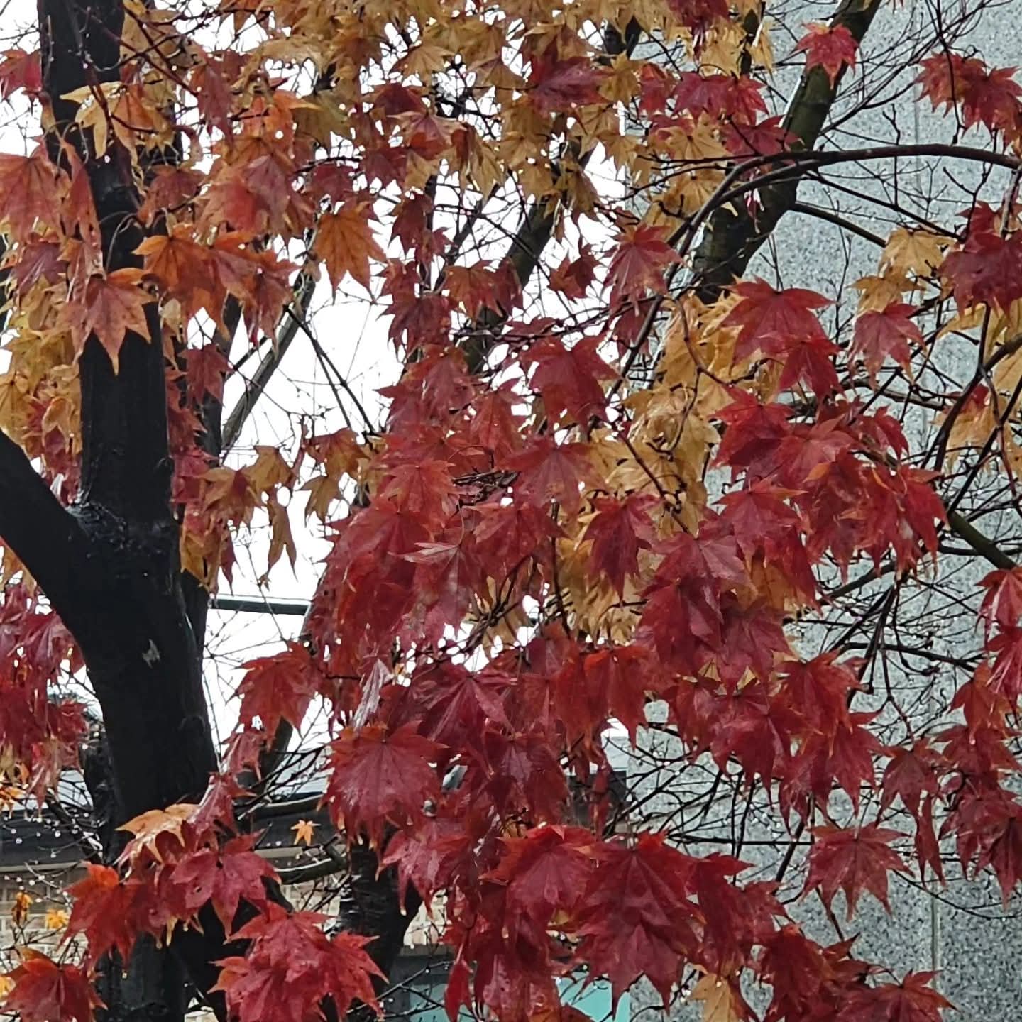 낙엽 진 길가에 촉촉히 내리는 비