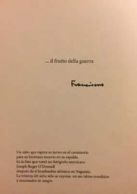첫 번째 사진은 영아로 보이는 숨진 동생을 업은 소년이 화장터 앞에서 장례 순서를 기다리며 굳은 표정으로 서 있다. 카드 뒷면에는 '전쟁의 결과'(The fruit of war)라는 제목과 함께 사진에 대한 설명이 담겼다. 교황은 제목 아래에 자신의 서명을 남겼다. 현지 언론들은 교황이 이번 사진을 직접 골랐다고 보도했다. 사진 캡션에는 "어린 소년의 슬픔은 피를 흘리는 입술을 깨무는 표정에서만 드러날 뿐"이라는 내용이 포함됐다.
