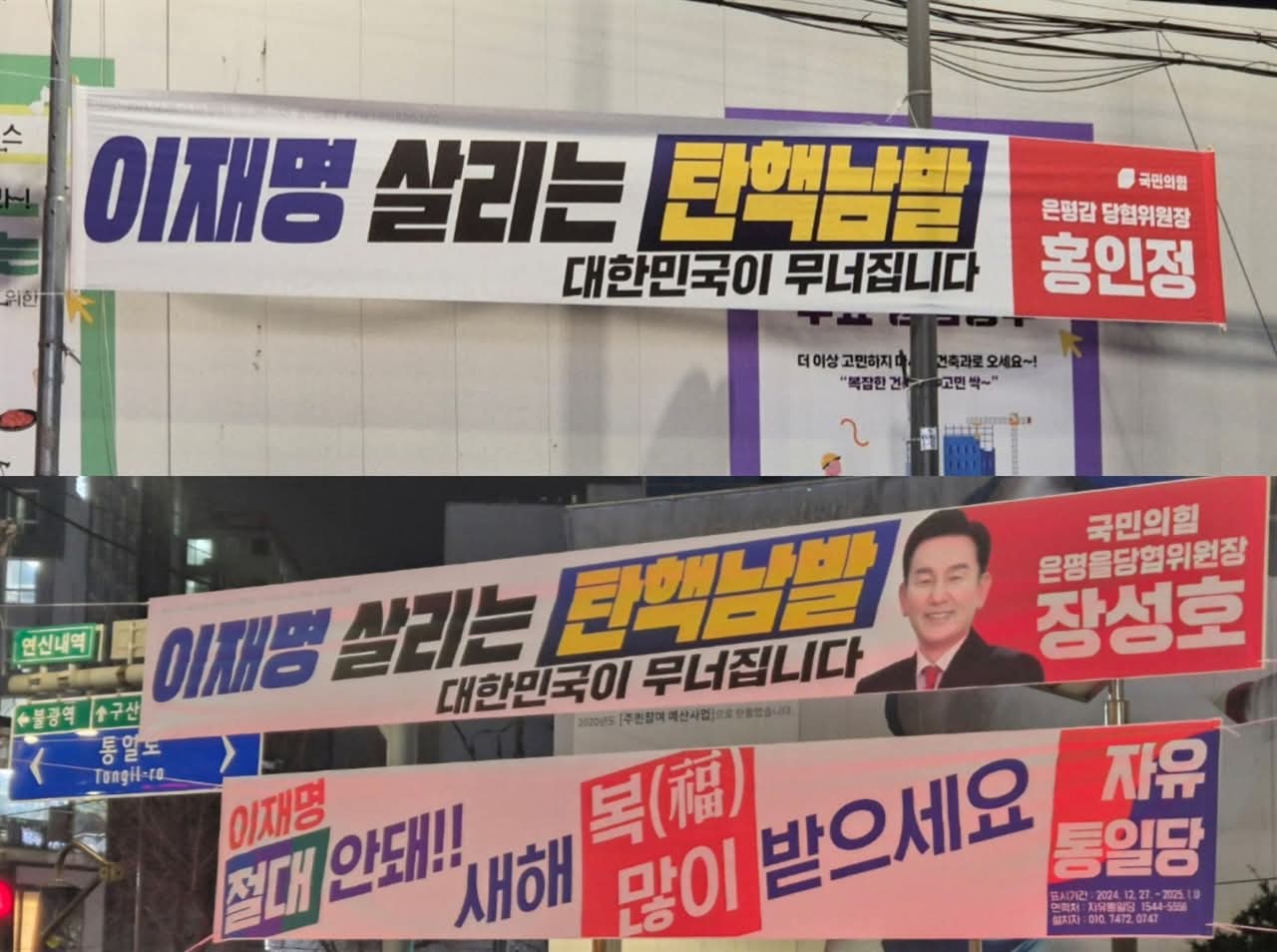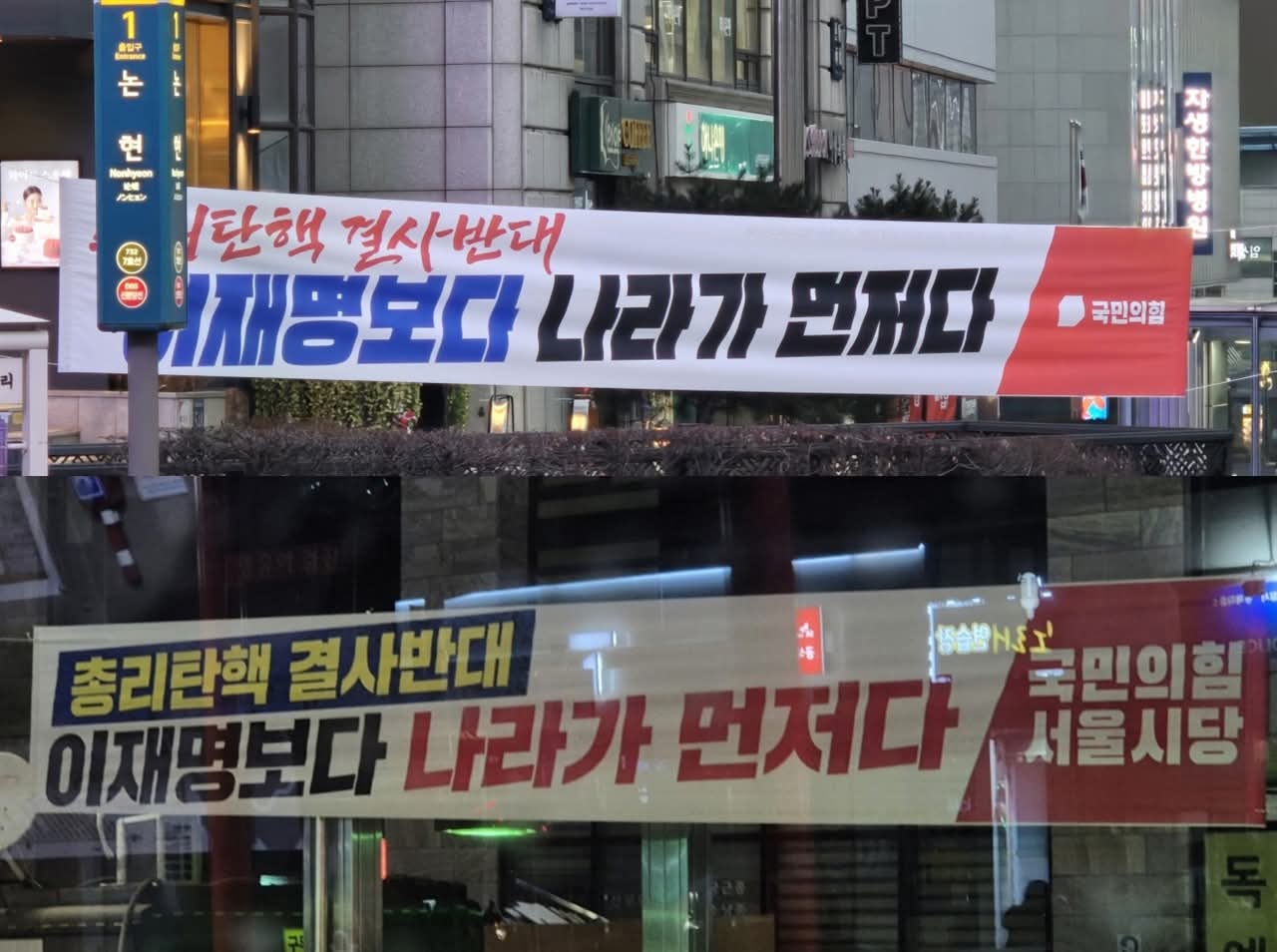 더 속상한 것은 우리가 그 후에도 이같이 '전도된 현실'을 목격한다는 점이다. 나에게는 특히 거리의 국민의 힘 현수막들이 속을 터지게 한다. 그리고 국법 파괴자가 오히려 철옹성을 쌓고 법 운운하고 있다. 하수인들은 국격 추락의 원인으로 윤의 체포는 제쳐놓고 자신의 알리바이를 위한 온갖 구실을 찾고 있다. 거짓말, 은폐와 왜곡, 위선과 허위, 기회주의, 적반하장, 참으로 추하고 비열하다. 이런 식으로 거리에 현수막을 걸었다. 이재명과 탄핵은 관계 없다. 나라가 무너지고 있는 것은 '12.3 게엄'을 일으킨 쿠데타, 즉 내란이다. 거리를 오염시키고, 일부 시민들을 왜곡시킨다.