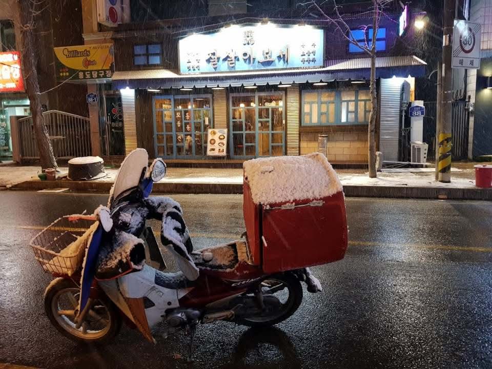 눈 오는 날 밤에도 일해야 하는 배달 집