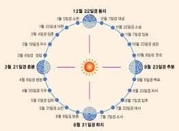 오늘은 춥지만 절기상 입춘이다. '춘(春)', '봄'자 소리만 들어도 기분 좋다. 왜 오늘이 입춘인지는 다음 지도를 보면 안다. 우리가 잘 알고 있는 24절기는 태양의 움직임을 이용하여 24개의 지점으로 구분한 표시를 말한다. 한 달에 2개의 절기가 반드시 들어가며, 계절 당 6개의 절기로 이루어지며 3개월 마다 바뀌는 계절의 변화를 말한다.