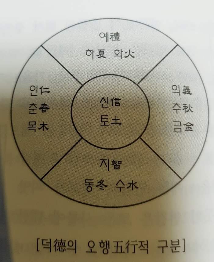 덕이란 구체적으로 ‘仁義禮智信(인의예지신)’의 실천과 습관화를 말한다. ‘인의예지신’의 덕목들을 변화하는 현실 속에서 그때그때에 알맞게 실천하고 또 습관화하는 것이 바로 덕이 되는 것이다.