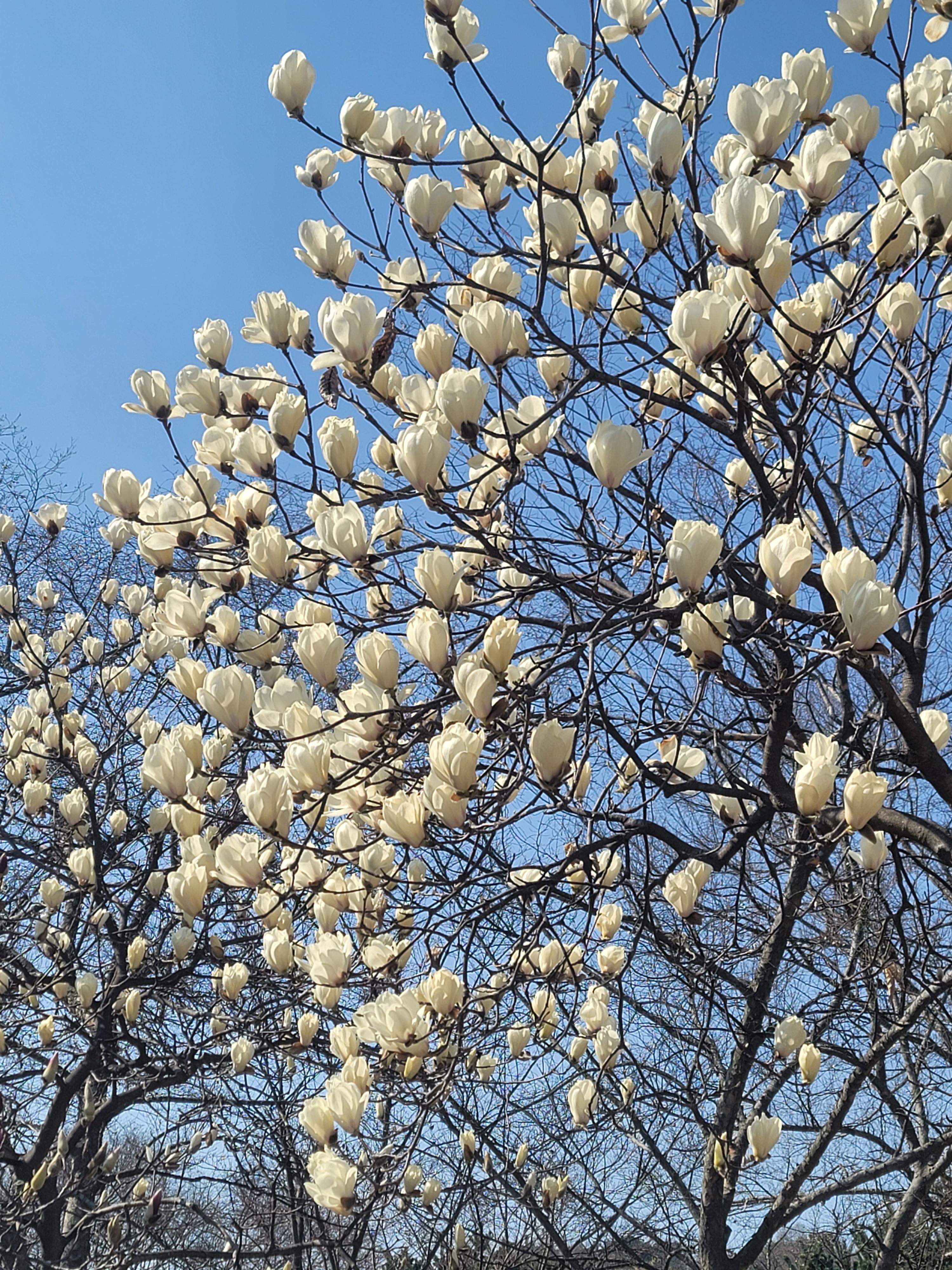 오늘 오후에는 목련이 피어 있는 길을 산책할 계획이다. 시인처럼, "목련 아래를 지날 때는//가만가만//발소리를 죽"이면서 걸을 생각이다.