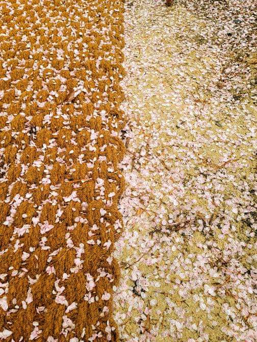 최근에 다시 발견한 산책로에서 찍은 오늘 아침 사진 처럼, 만발했던 벚나무 꽃이 풍장으로 쓰러졌다. 꽃들이 피고 지는 모습이 제 각각이다. 그런 모습 속에서 우리는 우리들의 삶과 죽음을 볼 수 있다. 꽃은 피었으면 진다. 순리이다. 낙화가 없으면 녹음도 없고, 녹음이 없으면 열매도, 씨도, 그리하여 그 이듬해의 꽃도 없다. 그러니 우리도. 너무 현재를 붙잡으려 하며 추해지지 말아야 한다. 우리도 때가 되면 결별하고 여행할 줄 알아야 한다.