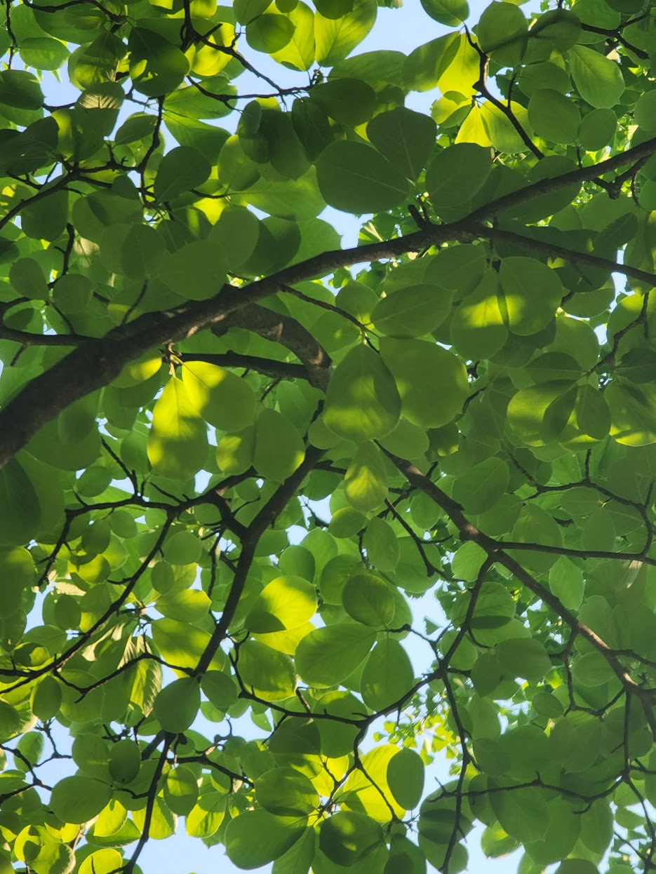 요즈음 거리를 나가면, 오월의 초록 물, 신록이 마음을 깨끗하게 정화해 준다. 더 정확히는 연두와 초록이 햇살과 노닐며, 상큼한 바람이 사이사이 입맞춤을 하고, 바람 길 따라 달콤한 향기를 발산한다. 나는 단풍보다 신록에 더 끌린다. 5월이 신록의 달이란 이야긴 어려서 부터 들었지만 신록의 참된 의미를 따져본 적은 없었다. 어제 늦은 오후에 산책을 나가 신록을 만끽했다. 아침 사진은 목련 나무 밑에서 찍은 것이다.