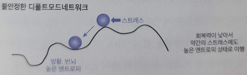 다음 그림처럼 안정적인 디폴트모드네트워크에서는 회복력이 높아서 스트레스를 받아도 금세 고요와 평안을 되찾는다.