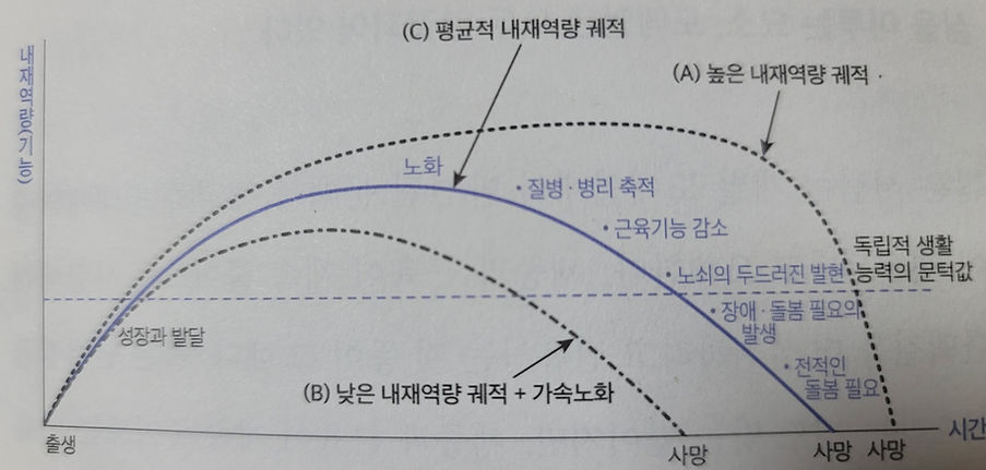 이 그림에서 A 곡선은 높은 내재역량의 궤적이다. 독립적 생활 능력의 문턱이 늦게까지 가고, 바로 죽는다. C곡선은 평균적 내재역량의 궤적이다. B곡선은 낮은 내재역량의 궤적으로 가속녹화를 겪는 거다. 일찍 죽는다. 여기서 두 가지를 더 읽는다.