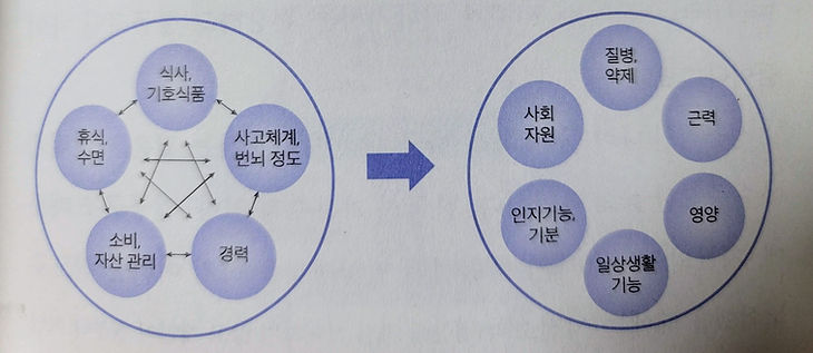 - 노화의 속도를 늦추는 세 번째 기둥: 건강과 질병(Medical issues)으로 나이를 먹으면 아픈 것이 당연하다는 착각을 버린다. 질병이 생기기 이전의 문제를 이야기 한다.
