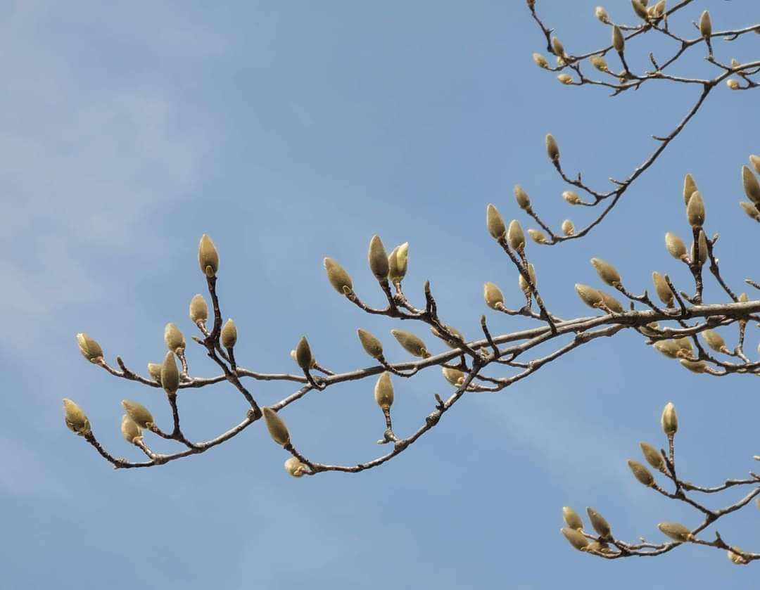 그리고『중용』의 머릿장에는 “천명지위성(天命之謂性)이요, 솔성지위도(率性之謂道)요, 수도지위교(修道之謂敎)니라”고 되어 있는데, '하늘이 우리에게 명해준 것이 우리들의 성품'이므로 곧 "천명지위성"이고, '하늘에서 명을 받아 타고난 성품'을 그대로 따라가는 것이 '길(道)'이므로 곧 "솔성지위도"이고, '그 성품을 따르는 도를 잘 닦아 나가 마름질하는 것이 공부'이므로 곧 "수도지위교"이다. 다시 말하면, 도를 잘 닦아 나가는 것, 즉 마름질하는 것이 하나의 교육적인 가르침(敎)이 되는 것이다. 성(性), 도(道), 교(敎)로 시작하는 <<중용>>의 첫 문자을 외우면 마음이 가라앉는다. <<도덕경>> 제10장의 다음 문장은 내일 정밀 독해를 한다. 오늘 아침 공유하는 시는 법정 스님이 쓴, <사람이 하늘처럼>이라는 시이다. 사진은 파란 하늘을 보다가 덤으로 얻은 목련 꽃봉오리이다.
