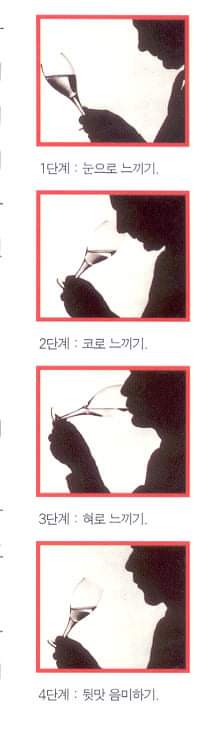 와인을 읽지 않고, 오늘은 와인을 마시는 방법에 대한 이야기를 한다. 와인은‘원샷’하지 않는다. 원래 와인은 요리와 함께 마시기 시작하여 요리와 함께 끝내는 식중 주이다. 원칙적으로는 디저트가 나오기 전까지만 마신다. 이때 와인은 시각․후각․미각 등 오감을 총동원하여 마신다. 왜냐하면 와인의 매력은 색깔, 향, 맛 세 가지이기 때문이다. 와인을 마시는 즐거움은 이를 최대한 감상하고 느끼는 것이다. 이를 위해서는 한 순간의 정신 집중으로 눈, 코, 입의 관련 기관을 모두 사용해야 한다.