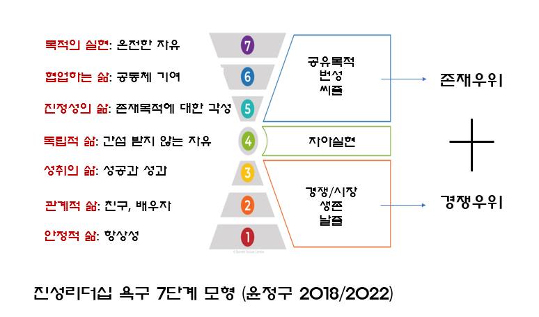 위 그림에서 보는 "진성리더십 7단계 모형"은 매슬로우의 욕구 5단계 모형을 "진성리더의 여정"에 맞춰 확장한 것이다. 갈무리하여 공유한다.