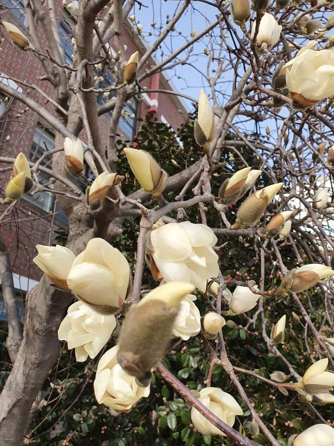 어제는 코로나19로 얼어붙었던 가슴이 녹았는지, 복합와인문화공간 <뱅샾62>에 단골들이 여럿 왔다. 덩달아 나도 '주님'과 함께 즐거운 저녁을 보냈다. 내가 늘 걷기 운동하는 동네 초등학교에 학생들은 없는데, 목련은 참지 못하고 먼저 꽃을 피웠다. 오늘 아침 사진처럼 조심스럽게. 오늘 아침 공유하는 헬렌 켈러의 말처럼, "행복의 한 쪽 문이 닫히면 다른 쪽 문이 열린다." 이번 주말은 봄 꽃들을 만나러 들로 나갈 생각이다.