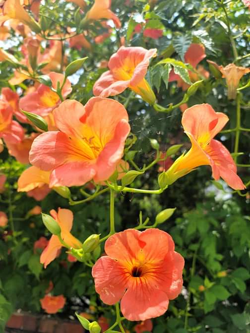 그제 아침에는 곱게 홀로 핀 능소화 꽃무리를 만났다. 봄의 꽃들이 다 지고, 뜨거운 여름에 당당히 피는 꽃이 능소화이다. 꽃 피우는 것을 힘들어 하는 꽃은 없다. 핀 꽃이 덥다고 모습을 바꾸는 꽃은 없다. 장마 더위에 귀를 활짝 펴고 웃는 능소화를 보라. 일반적으로 꽃이 피고 질 때는 꽃이 시들어서 지저분하게 보인다. 그러나 능소화는 꽃이 질 때 예쁜 모습 그대로 뚝 떨어진다. 꽃이 시든 채 나무에 매달리는 경우가 거의 없다. 그래서 옛날 양반집에 주로 이 능소화를 많이 심었다고 한다. 지금은 이곳 저곳에서 쉽게 눈에 띤다. 몇일 전에 못다 한 능소화 이야기를 한다. 능소화의 꽃말은 영광과 명예라고 한다. 조선 시대에 자원급제를 한 사람의 화관 꽂아 주었기 때문에 능소화를 '어서화'라고도 한다. 꽃의 자태가 아름답고 고고하기 때문이었을 것이다.