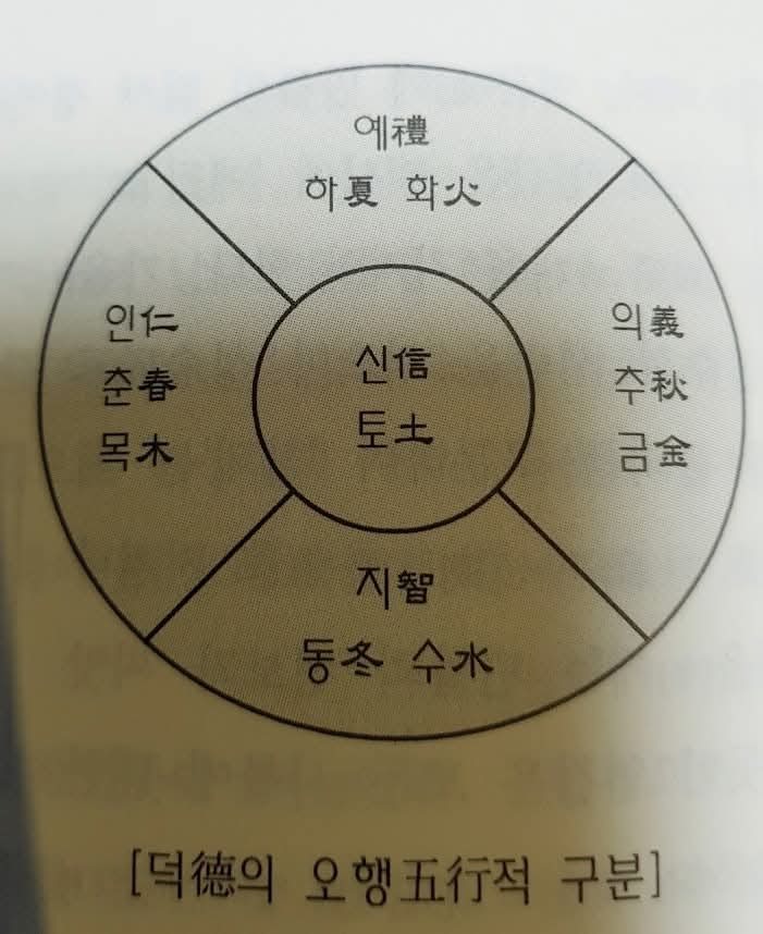 덕이란 구체적으로 ‘仁義禮智信(인의예지신)’의 실천과 습관화를 말한다. ‘인의예지신’의 덕목들을 변화하는 현실 속에서 그때그때에 알맞게 실천하고 또 습관화하는 것이 바로 덕이 되는 것이다.